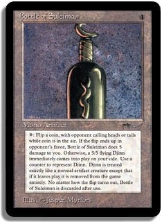 <1>: Flip a coin, with opponent calling heads or tails while coin is in the air. If the flip ends up in opponent's favor, Bottle of Suleiman does 5 damage to you. Otherwise, a 5/5 flying Djinn immediately comes into play on your side. Use a counter to represent Djinn. Djinn is treated exactly like a normal artifact creature except that if it leaves play it is removed from the game entirely. No matter how the flip turns out, Bottle of Suleiman is discarded after use.