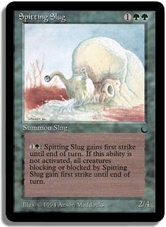 <1G>: Spitting Slug gains first strike until end of turn. If this ability is not activated, all creatures blocking or blocked by Spitting Slug gain first strike until end of turn.
