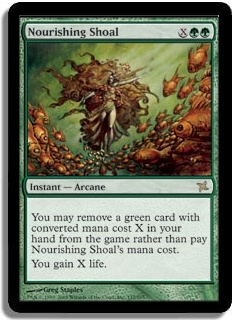 You may remove a green card with converted mana cost X in your hand from the game rather than pay Nourishing Shoal's mana cost.