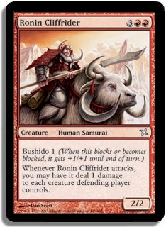 Whenever Ronin Cliffrider attacks, you may have it deal 1 damage to each creature defending player controls.