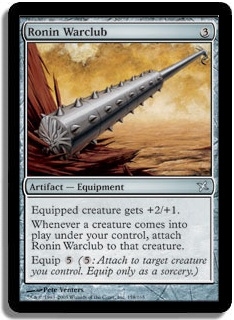 Whenever a creature comes into play, attach Ronin Warclub to it.