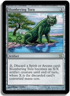 2, discard a Spirit or Arcane card: Slumbering Tora becomes an X/X artifact creature until end of turn, where X is the discarded card's converted mana cost.