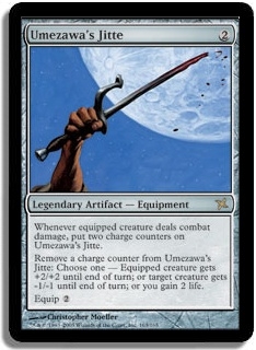 Whenever equipped creature deals combat damage, put two charge counters on Umezawa's Jitte.