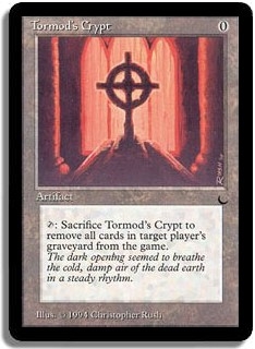 <T>: Sacrifice Tormod's Crypt to remove all cards in target player's graveyard from the game.