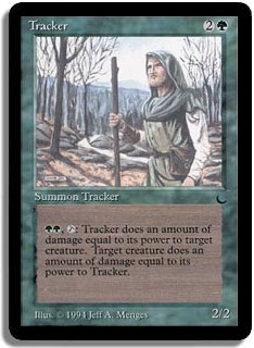 <GG,T>: Tracker does an amount of damage equal to its power to target creature. Target creature does an amount of damage equal to its power to Tracker.