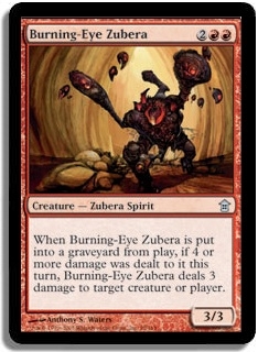 When Burning-Eye Zubera is put into a graveyard from play, if 4 or more damage was dealt to it this turn, Burning-Eye Zubera deals 3 damage to target crature or player.