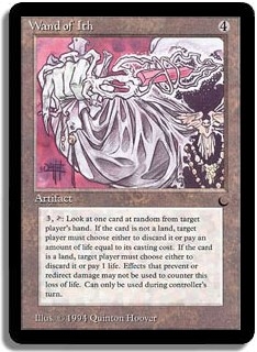 <3,T>: Look at one card at random from target player's hand. If the card is not a land, target player must choose either to discard it or pay an amount of life equal to its casting cost. If the card is a land, target player must choose either to discard it or pay 1 life. Effects that prevent or redirect damage may not be used to counter this loss of life. Can only be used during controller's turn.