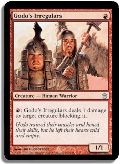 R: Godo's Irregulars deals 1 damage to target creature blocking it.