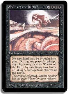 No new land may be brought into play. During any player's upkeep, any player may destroy Worms of the Earth by sacrificing two lands or taking 5 damage from Worms of the Earth.