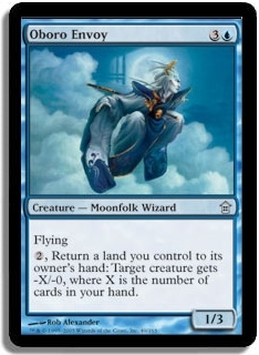 2, Return a land you control it its owner's hand: Target creature gets -X/-0, where X is the number of cards in your hand.(Eratta: Until end of turn.)