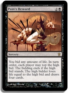 You bid any amount of life. In turn order, each player may top the high bid. The bidding ends if the high bid stands. The high bidder loses life equal to the high bid and draws four cards.