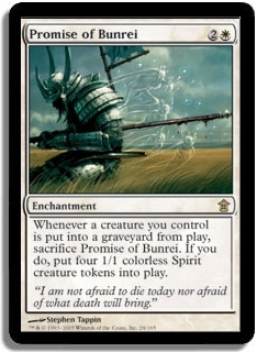 Whenever a creature you control is put into a graveyard from play you may sacrifice Promise of Bunrei. If you do, put four 1/1 colourless spirit tokens into play.