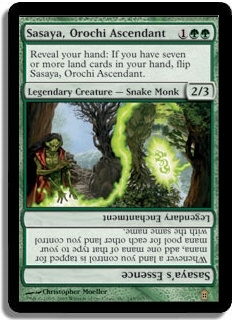 Reveal your hand: If you have seven or more land cards in your hand, flip Sasaya, Orochi Attendant.