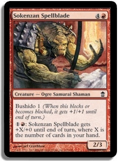 1R: Sokenzan Spellblade gets +X/+0 until end of turn, where X is the number of cards in your hand.