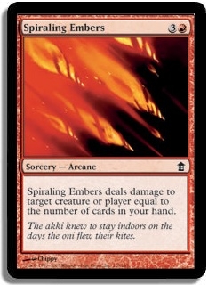 Spiraling Embers deals damage to target creature or player equal to the number of cards in your hand.