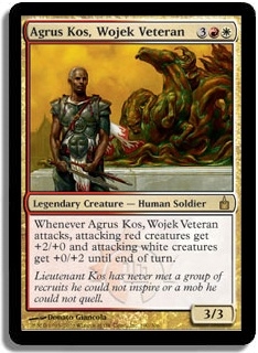 Whenever Agrus Kos, Wojek Veteran attacks, attacking red creatures get +2/+0 and attacking white creatures get +0/+2 until end of turn.