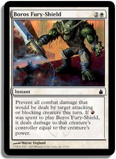 Prevent all combat damage that would be dealt by target attacking or blocking creature this turn. If R was spent to play Boros Fury-Shield, it deals damage to that creature's controller equal to the creature's power.