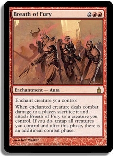 When enchanted creature deals combat damage to a player, sacrifice it and attach Breath of Fury to a creature you control. If you do, untap all creatures you control and after this phase, there is an additional combat phase.