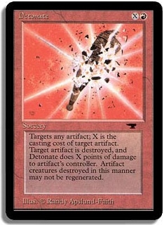 Bury target artifact. Detonate deals X damage to the artifact's controller, where X is the casting cost of the artifact.