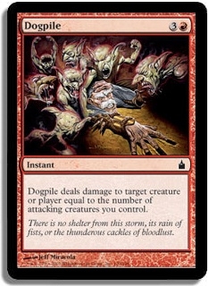 Dogpile deals damage to target creature or player equal to the number of attacking creatures you control.