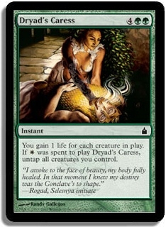 You gain 1 life for each creature in play. If any W was spent to play Dryad's Caress, untap all creatures you control.