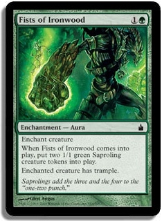 When Fists of Ironwood comes into play, put two 1/1 green Saproling creature tokens into play.