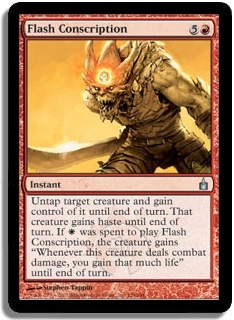 Untap target creature and gain control of it until end of the turn. That creature gains haste until end of turn. If W was spent to play Flash Conscription, the creature gains "Whenever this creature deals combat damage, you gain that much life." until end of turn.