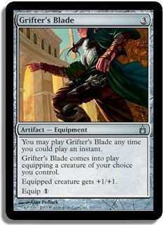 Grifter's Blade comes into play equipping a creature of your choice you control.