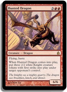 When Hunted Dragon comes into play, put three 2/2 white Knight creature tokens with first strike into play under target opponent's control.