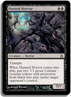 When Hunted Horror comes into play, put two 3/3 green Centaur creature tokens with protection from black into play under target opponent's control.
