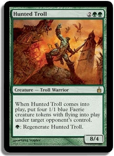 When Hunted Troll comes into play, put four 1/1 blue Faerie creature tokens with flying into play under target opponent's control.