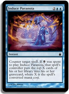 Counter target spell. If B was spent to play Induce Paranoia, that spell's controller puts the top X cards of his or her library into his or her graveyard, where X is the spell's converted mana cost.