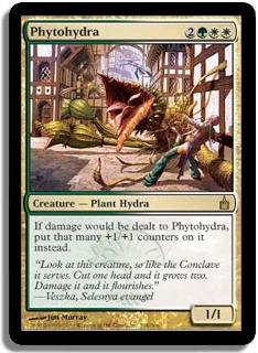 If damage would be dealt to Phytohydra, put that many +1/+1 counters on it instead.