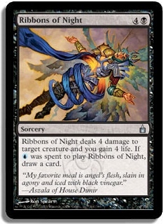 Ribbons of Night deals 4 damage to target creature and you gain 4 life. If U was spent to play Ribbons of Night, draw a card.