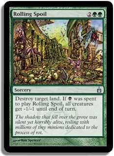 Destroy target land. If any B was spent to play Rolling Spoil, all creatures get -1/-1 until end of turn.