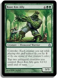 Tap two untapped creatures you control: Root-Kin Ally gets +2/+2 until end of turn.