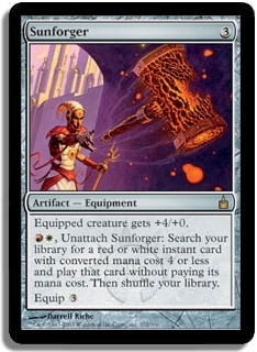 RW, Unattach Sunforger: Search your library for a red or white instant card with converted mana cost 4 or less and play that card without paying its mana cost. Then shuffle your library.