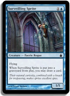 When Surveilling Sprite is put into a graveyard from play, you may draw a card.