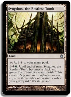 3BG: Until end of turn, Svogthos, the Restless Tomb becomes a black and green Plant Zombie creature with "This creature's power and toughness are each equal to the number of creature cards in your graveyard." It's still a land.
