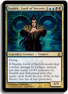 If Szadek, Lord of Secrets would deal combat damage to a player, instead put that many +1/+1 counters on Szadek and that player puts that many cards from the top of his or her library into his or her graveyard.