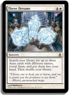 Search your Library for up to three Aura cards with different names, reveal them, and put them into your hand. Then shuffle your library.