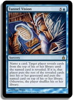 Name a card. Target player reveals cards from the top of his or her library until the named card is revealed. If it is, that player puts the rest of the revealed cards into his or her graveyard and puts the named card on top of his or her library. Otherwise, the player shuffles his or her library.