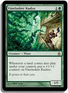 Whenever a land comes into play under your control, put a +1/+1 counter on Vinelasher Kudzu.