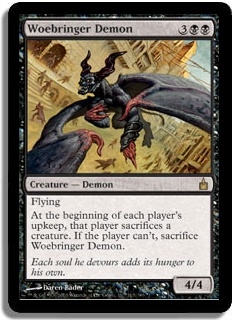 At the beginning of each player's upkeep, that player sacrifices a creature. If the player can't, sacrifice Woebringer Demon.