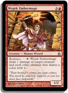Radiance - Tap: Wojek Embermage deals 1 damage to target creature and each other creature that shares a color with it.