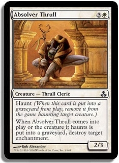 When Absolver Thrull comes into play or the creature it haunts is put into a graveyard, destroy target enchantment.