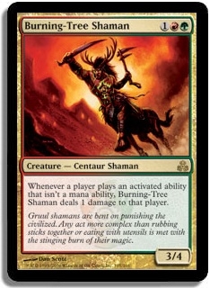 Whenever a player plays an activated ability that is not a mana ability, Burning-Tree Shaman deals 1 damage to that player.