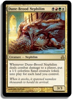 Whenever Dune-Brood Nephilim deals combat damage to a player, put a 1/1 colorless Sand creature token into play for each land you control.