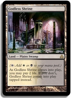 As Godless Shrine comes into play, you may pay 2 life. If you don't, Godless Shrine comes into play tapped instead.
