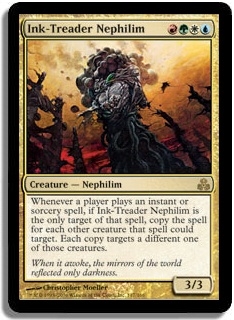 Whenever a player plays an instant or sorcery spell, if Ink-Treader Nephilim is the only target of that spell, copy the spell for each other creature that spell could target. Each copy targets a different one of